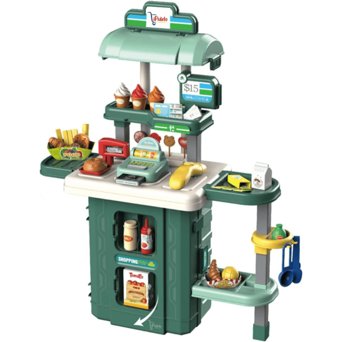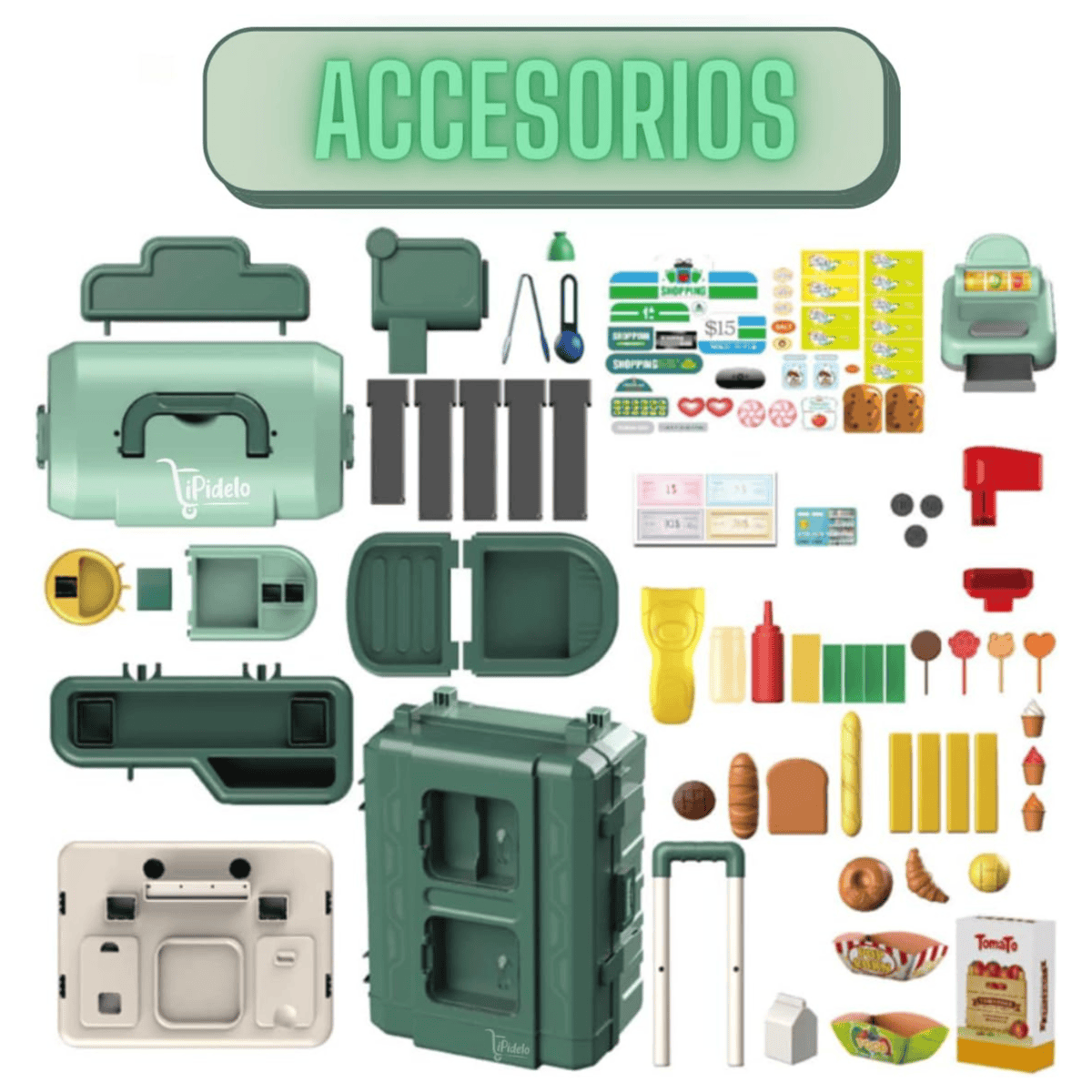 - Contenido: Maleta 2 en 1, cajero automático con sonidos, dinero de juguete, comida de juguete (frutas, verduras), stickers, canasta y más accesorios.